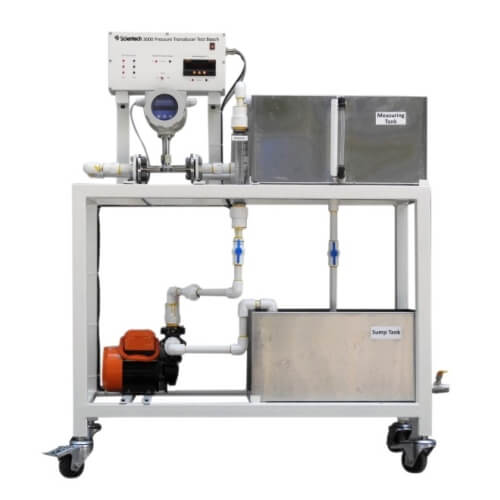 Scientech 3000 Impeller type flowmeter Test bench includes impeller flow transmitter, rotameter, 4-20ma current display, ss sump tank and ss measuring tank. Scientech 3000 allows the user to perform a wide range of experiments while learning intricate concepts in an interactive and simple manner.