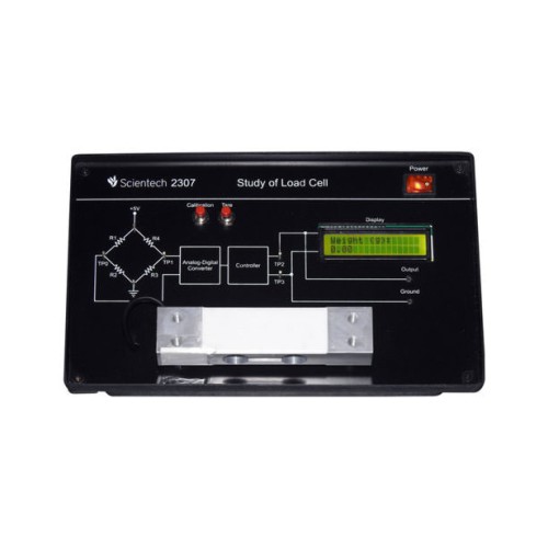 Scientech 2307 is a platform for the study of load cells and their application for weight measurement. Different weights are provided for linearity and sensitivity measurements. A 16×2 LCD display shows the weight in grams.